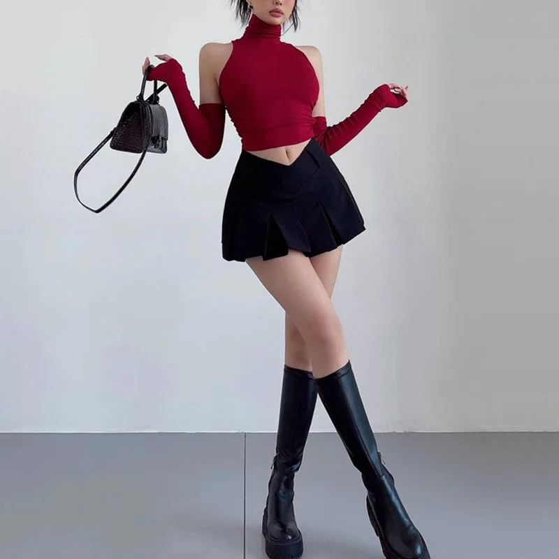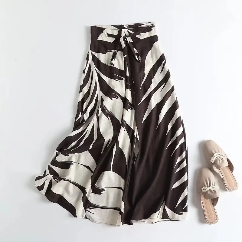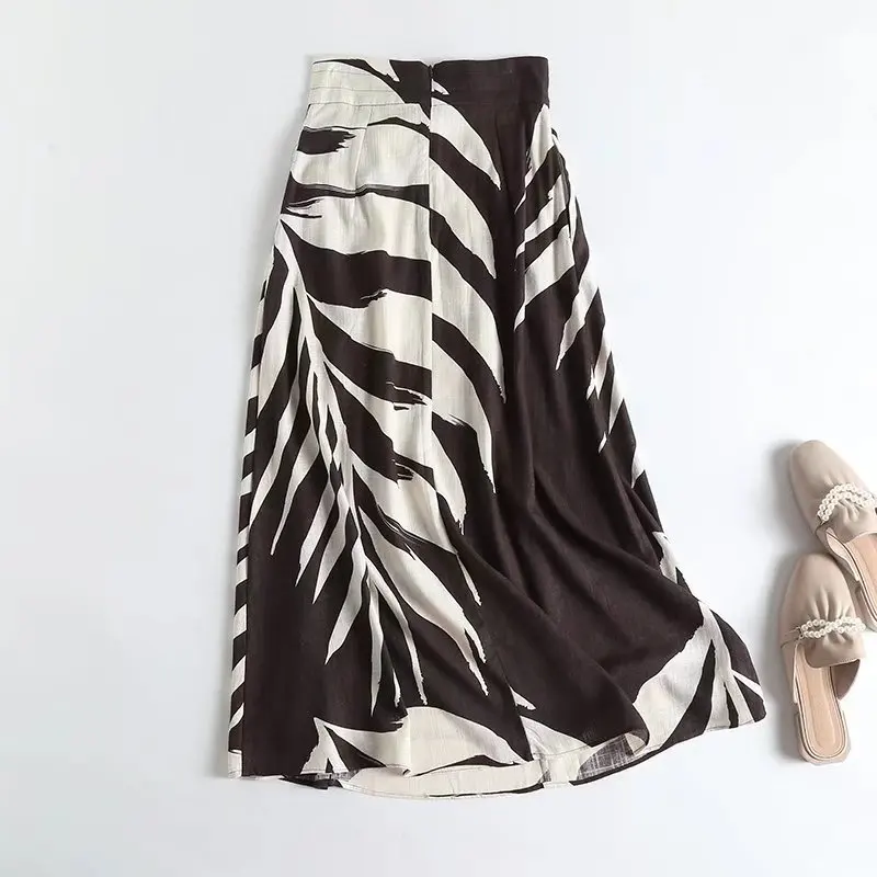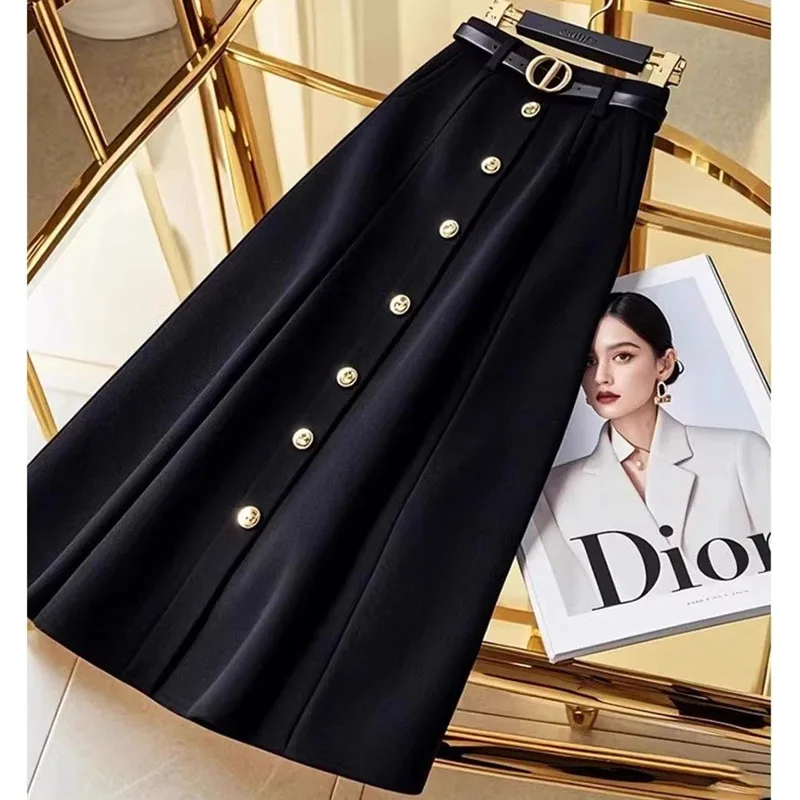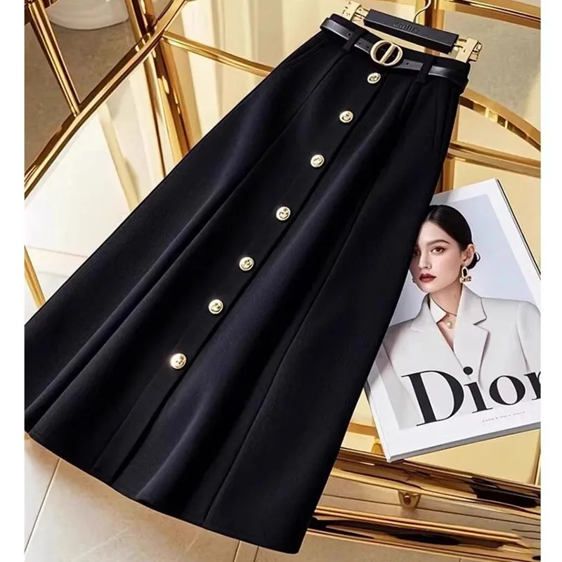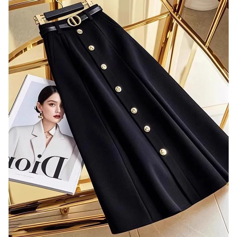 This A-line skirt features a high waist and a large hem, creating a flattering silhouette that exudes style and sophistication.
